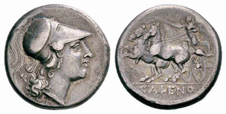 | Sambon 908 | Cales, Campania. AR Didrachm. 265-240 BC. 21 mm, 6.75 g. Head of Athena right, in undecorated Corinthian helmet, round shield behind head. / CALENO, Nike in biga galloping left. Sambon 908; Paris 166 (this coin); SNG France I 423 (ditto); Naples Santangelo 647. | Text | Image |