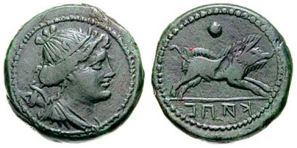 | Sear SG 551 | Campania, Capua. ca 216-211 BC. AE Uncia. Bust of Artemis right, bow and quiver over left shoulder / Wild boar right; dot above. SNG ANS 210-211; BMC 3-4. |