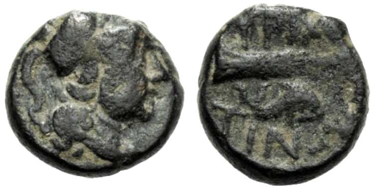 | SNG ANS 696 | Hyria, Calabria (or Hyrium, Apulia?). AE11, ca 250-200 BC. 2.39 g. Head of Athena right, wearing Corinthian helmet. / YΡIA-TINΩN, rudder over dolphin right. SNG ANS 696-698; HN Italy 666; SNG Cop 646. | Text | Image |