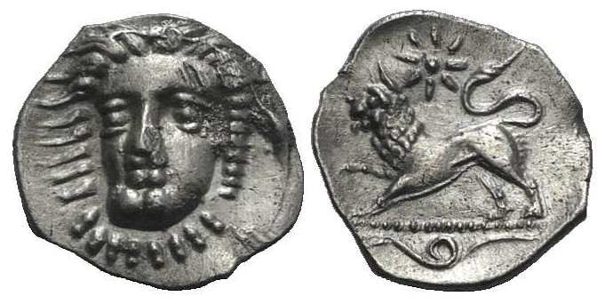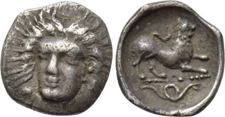 | HN Italy 619 type 1 | Phistelia, Campania, AR obol, ca 325-275 BC. 11 mm, 0.59 g. Head of nymph facing front, slightly left. / Lion crouching left, coiled serpent below. HN Italy 619, type 1; Sambon 844; Hoover HGC 1, 505; Drouot (1927) 101-103. | Text | Image |