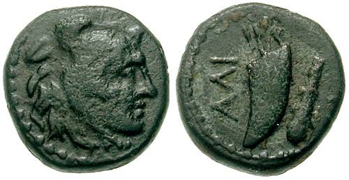 | Milne(1938) 2 | Septimius Severus and Caracalla, AE39 of Alinda, Caria. 208-211 AD. AVT K Λ CEΠ CEOYHΡOC KAI M AYΡ ANTΩNEINOC, laureate, cuirassed bust of Sept. Severus right, facing draped bust of Caracalla left / EΠI AΡ KOΡ MENIΠΠOY AΛINΔEΩN ACYΛO MENOC HΡAKΛNΔOC E I (partially retrograde), Herakles, naked, standing front, head right, holding club and lionskin, shaking hands with Septimius Severus, standing front, head left, in military dress, holding spear; altar between them. Milne (NC 1938) p. 255, 2. | Text | Image |