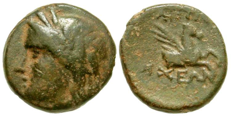 | SNG Tübingen 3335 | Alabanda, Caria, as Antioch, AE13, civic issue, 197-189 BC. 1.52 g. Laureate head of Apollo left. / ANTI-OXEΩN above and beneath Pegasos leaping right. SNG Tuebingen 3335. | Text | Image |