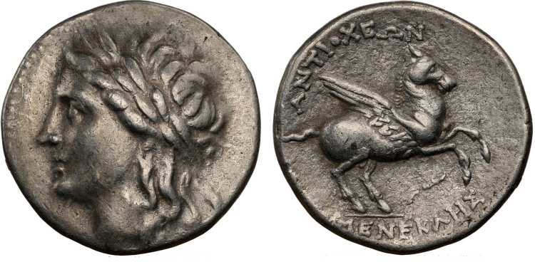 | SNG vA 2382 | Alabanda as Antioch, Caria. AR tetradrachm. 197-189 BC. Magistrate Menekles. 28 mm, 16.75 g. Laureate head of Apollo left. / ANTIOXEΩN MENEKΛHΣ, Pegasos leaping right. SNG von Aulock 2382; Pozzi 2561. | Text | Image |