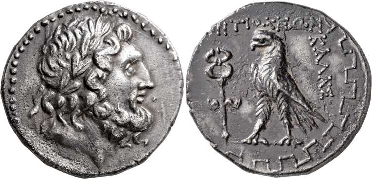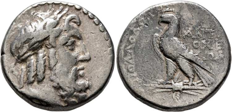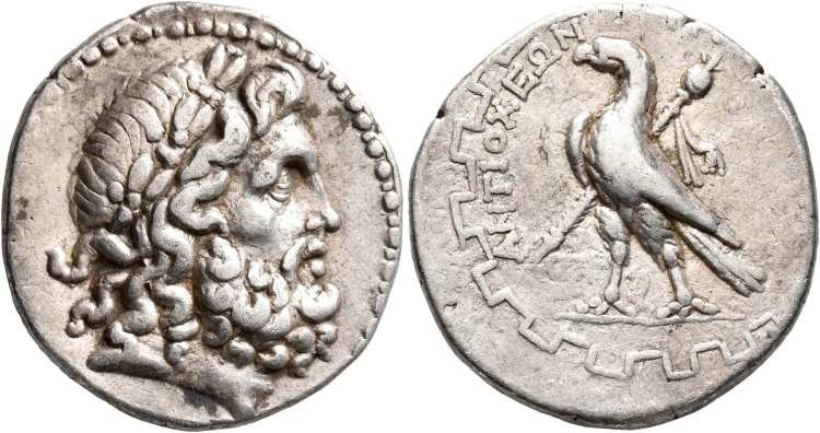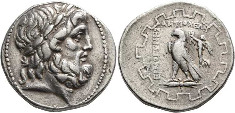 | Thonemann 8 | Antioch ad Maeandrum, Caria, AR tetradrachm, ca. 90-60 BC. 27 mm, 15.63 g. Magistrate Solon. Laureate head of Zeus right. / ANTIOXEΩN ΣOΛ, eagle standing left on thunderbolt within maeander pattern. Thonemann 8a-8b; HN Caria 1530; Paris 98. | Text | Image |