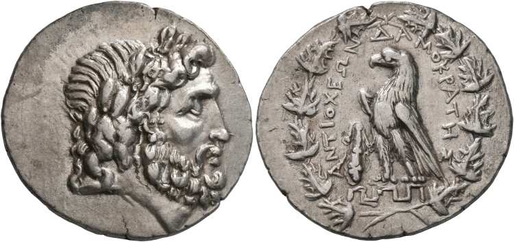 | Thonemann 18a-c | Antioch ad Maeandrum, Caria, AR tetradrachm, ca. 90-60 BC. 30 mm, 16.15 g. Magistrate Damokrates. Laureate head of Zeus right. / ANTIOXEΩN ΔAMOKΡATHΣ, eagle standing left on maeander pattern, lionskin draped over club in left field; all within oak wreath. Thonemann 18a-18c. | Text | Image |