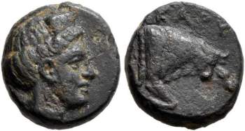 | Klagenfurt 85 | Karyanda, Caria. AE11, 450-350 BC. 1.58 g. Female head right, wearing stephane. / KAΡY, forepart of bull kneeling right. ΘE below. Imhoof, Klagenfurt 95; Konuk 7 in "Hommages à Raymond Descat". | Text | Image |