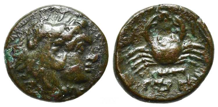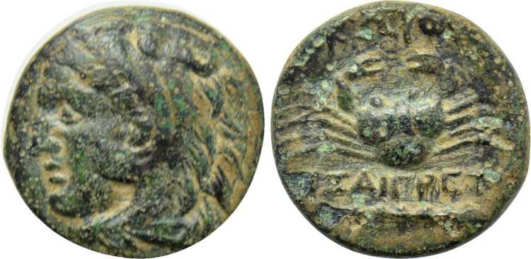 | BMC 96 | Kos, Caria, AE15 civic issue, 260-210 BC, 2.42 g. Magistrate Exaigretos. Head of Herakles left, wearing lionskin headdress. / KΩION EΞAIΓΡETOΣ above and beneath crab, club below. BMC 96; SNG Cop 644; Ingvaldsen XVI, 26. | Text | Image |