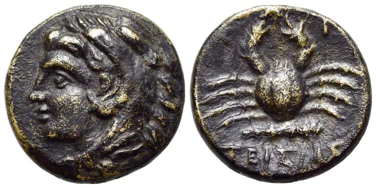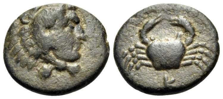 | BMC 25 | Kos, Caria, AE, 1.29 g. ca 4th century BC. Bearded head of Herakles right / KΩI, Crab, club above. BMC 25. | Text | Image |