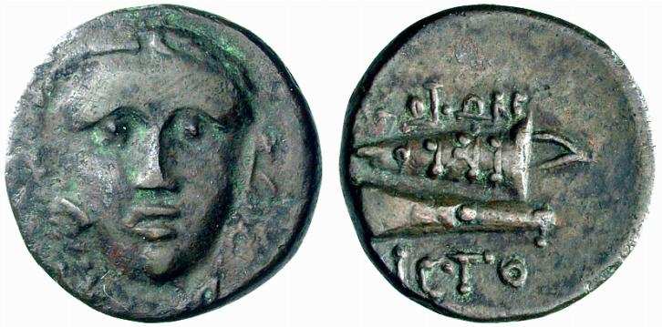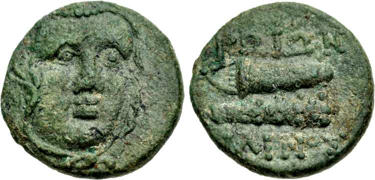 | RPC 2724 | Kos, Caria, Nikias, tyrant, ca. 30 BC, AE32, 23.66 g. Magistrate Antiochos. NIKIAΣ, lightly bearded and bare head of Nikias right / KΩIΩN ANTIOXOΣ, laureate head of Asklepios right. RPC 2724; BMC 196; SNG Cop 687; Paton-Hicks 234. | Text | Image |