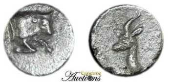 | Rosen 611 | Uncertain Carian . Circa 500 BC. AR Stater. Forepart of a roaring lion right / Incuse punch divided into two halves. | Text | Image |