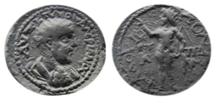 | SNG Levante Supp. 369 | Gallienus, AE of Flaviopolis, Cilicia. AD 253-254. Dated local year 181. 10.8 g. AY K ΓAΛΛIHNON CEB, laureate, draped and cuirassed bust right. / ΦΛAYIOΠOΛEITΩN around, AΠΡ (Ρ retrograde) in three lines in left field, Helios standing left, holding whip and raising right hand. SNG France II, 2206; Paris 585; SNG Levante Supp. 369 (this coin). | Text | Image |