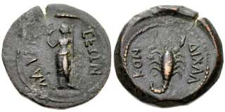 | SNG vA 5695 | Lalassis, Cilicia. AE17, Dichalkon, 3.20 g. AD 1-100. ΛAΛAΣΣEΩN, Aphrodite, naked to waist, standing left, holding flower and sceptre / ΔICAΛKON, scorpion. SNG von Aulock 5695 (this coin) = SNG Levante 563. | Text | Image |