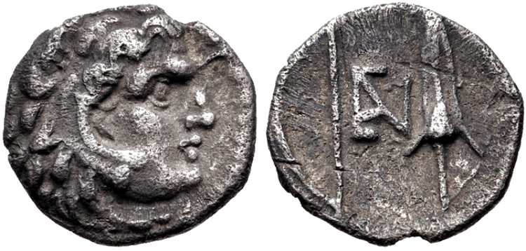 | Imhoof MG 47 | Nephelis, Cilicia, AR obol, 394–300 BC. 10 mm, 0.57 g. Head of Herakles right, wearing lionskin headdress. / Bow to left, EN monogram in centre, arrowhead upwards to right. Imhoof Monn. Gr. 47; BMC 112.1852; Svoronos 5a-5b in JIAN 1905 5a-5b; Yarkin Enaia 1-2; Tatar Nephilis Series 1 in AIIN 66 (2021). | Text | Image |