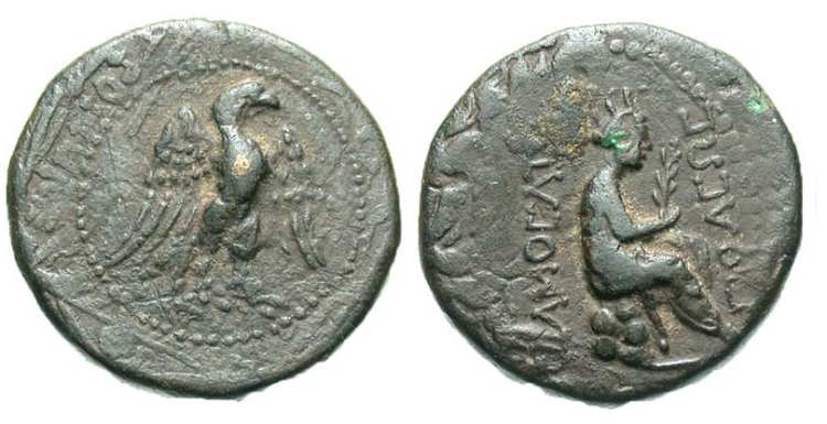 | BMC 15 | Samosata, Commagene, AE24, probably 39-38 BC. 12.59 g. Overstruck on an Antiochene tetrachalkon ("Head of Zeus/Zeus enthroned" type). Eagle standing slightly right, head right, wings spread. / CAMOCATΩ ΠOΛEΩC, Tyche sitting right on rock, holding palm branch. BMC 15, Kovacs 288; RIC I 3848. | Text | Image |