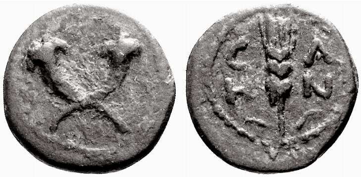 | Righetti VII, 320 | Samosata, Commagene, AE14, struck AD 117-138. Dated local year 58. 2.11 g. Crossed cornucopiae. / C-A H-N (date) in two lines across fields, corn-ear. Righetti VII, 320. | Text | Image |
