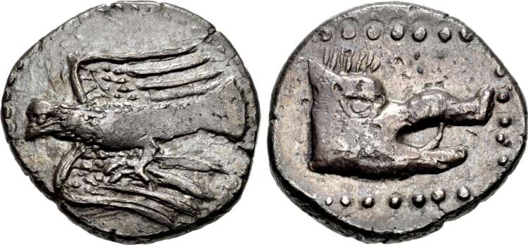 | Svoronos 50 | Lyttos, Crete, AR drachm, ca 450-300 BC. 5.53 g. Eagle flying right. / No legend, boar's head left. Svoronos 50; Weber (DE) 2161 (this coin). | Text | Image |