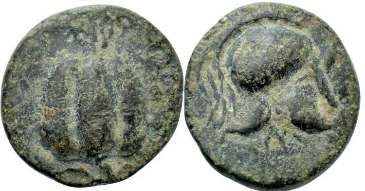 | BMC 7 | Melos, Cyclades. AE11, 400-314 BC. 1.5 g. Pomegranate. / Corinthian helmet right. BMC 7; Traite II-3, 1391. | Text | Image |