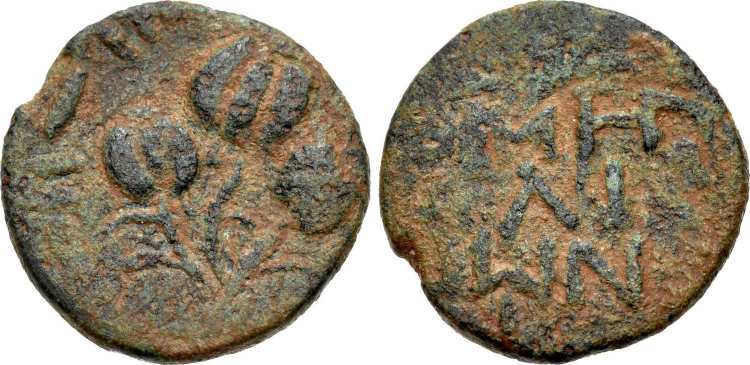 | BMC 41 | Melos, Cyclades, AE20. ca AD 50-120. 4.94 g. Three pomegranates on stalks, unclear legend (ΡΠE?) above. / MH-ΛI-ωN in three lines within wreath. BMC 41. | Text | Image |