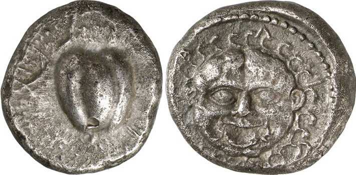 | Jameson 1295 | Melos, Cyclades, AR stater. Ca 420 BC. 14.08 g. Pomegranate with two leaves. / MAΛICN, gorgoneion head facing with serpents as hair. Jameson 1295 (this coin); Kraay, Melos 23; Traité II-3 1372. | Text | Image |