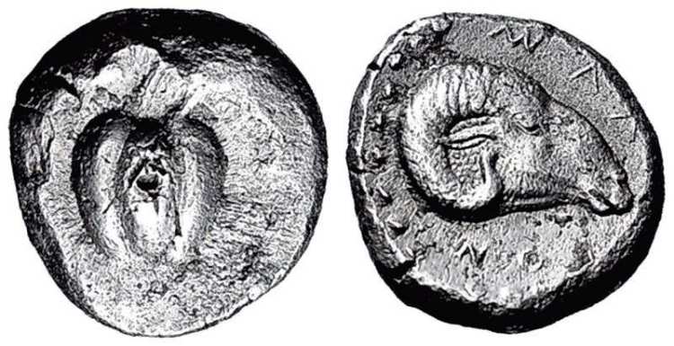 | Jameson 1296 | Melos, Cycladic Islands, AR stater, ca. 420-416 BC. 14.12 g. Pomegranate. / MAΛION, ram's head right. Jameson Coll. 1296 (this coin); Jameson Trouvaille 21 (ditto); Traité II-3, 1378 (ditto); Kraay-Hirmer 531. | Text | Image |