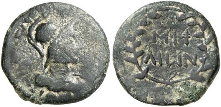 | BMC 38 | Melos, Cycladic Islands, 26 mm. 7.11 g. Unclear legend, helmeted bust of Athena right. / MHΛIωN in two lines within wreath. BMC 38. (Rev. legend var (form of Omega) of RPC II 1294 and Paris 270-271). | Text | Image |