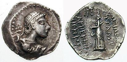 | Van't Haaff 2.2.1.1.a | Elymais, Kamnaskires II, Nikephoros. Circa 145-139 BC. AR Drachm. Diademed and draped, youthful male bust right. / BAΣIΛEΩΣ MEΓAΛOY KAMIΣKEIΡOY NIKHΦOΡOY, Artemis-Ishtar standing left, holding sceptre. Van't Haaff 2.2.1.1.a (this coin); Triton V, 1668. | Text | Image |