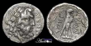 | Dewing 1444 | Koinon of Epiros. 234-168 BC. AR Drachm. Head of Zeus Dodonaios right; monogram behind / Eagle standing right on thunderbolt within wreath.