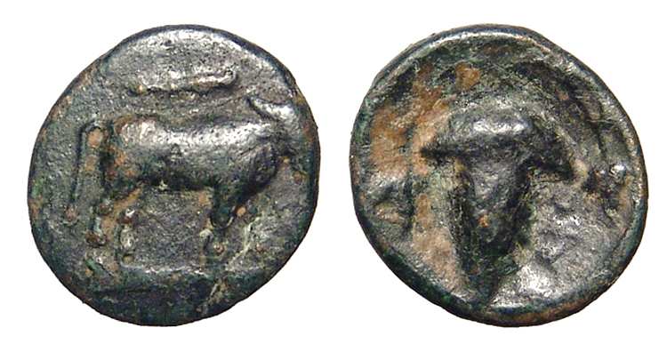 | BCD 40 | Euboian League, AE10. ca 375-338 BC. 1.6g. Head of the nymph Euboia right. / EY-B, head and shoulders of bull right. BCD 40; Wallace 1. | Text | Image |