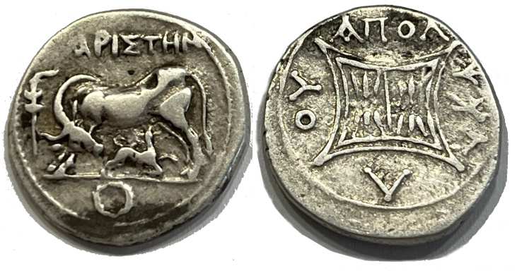 | Ceka 28 | Apollonia, Illyria. AR drachm. AΡIΣTΩN, Cow standing left, head right, suckling calf, grain ear to left, rudder below / AΠOΛ ΦIΛOΔAMOY around double stellar pattern within square with curved sides. Ceka 28; Mionnet 7. | Text | Image |
