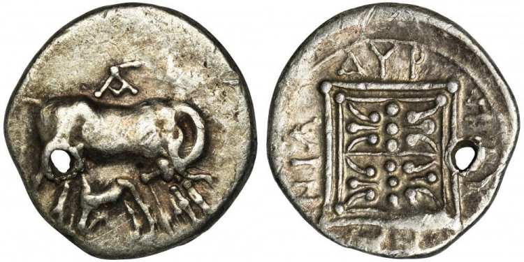 | SNG Cop 424v | Dyrrhachium, Illyria. Circa 450-350 BC. AR Stater. Cow standing left, suckling calf / ΔYΡ, double stellate pattern; club below. | Text | Image |