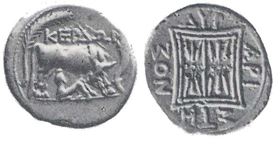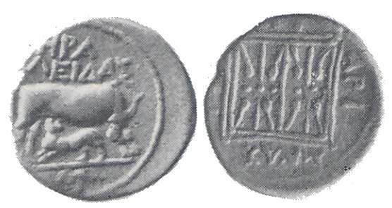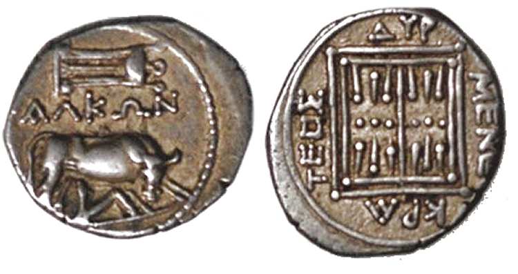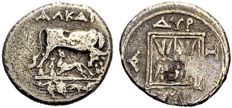| Ceka 51 | Dyrrhachium, Illyria, AR drachm. Magistrates Alkaios and Philotas. AΛKAIOΣ, cow standing right, head left, suckling calf, club below / ΔYΡ ΦI-ΛΩ-TA around double stellate pattern. Ceka 51 (omits the club). | Text | Image |