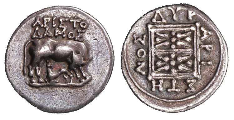 | Ceka 93 | Dyrrhachium, Illyria AR Drachm. 18 mm, 3.37 g. Magistrates Aristodamos and Philippos. AΡIΣTO-ΔAMOΣ above cow standing right, suckling calf. / ΔYΡ ΦI-ΛIΠ-ΠOY, square containing double stellate pattern. Ceka 93; Bakerr hoard 5324-5326. | Text | Image |