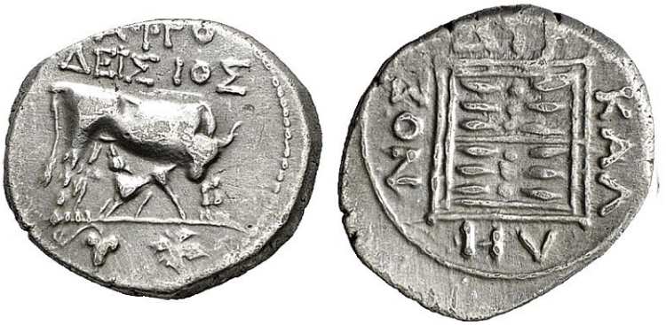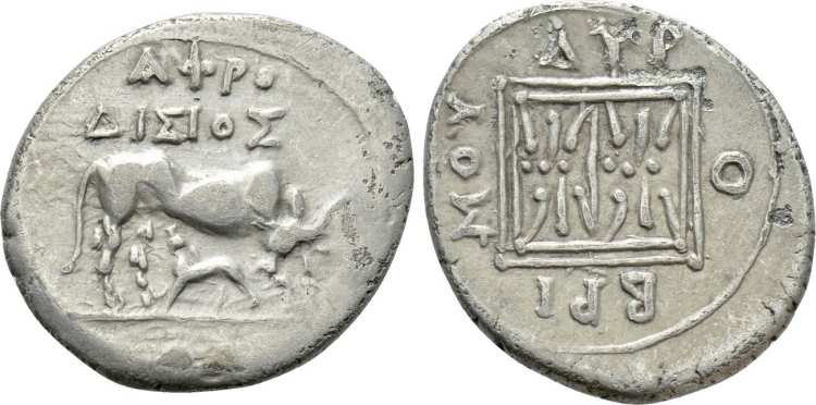 | Ceka 108 | Dyrrhachium, Illyria, AR drachm, ca 120-70 BC. Magistrates Afrodisios and Falakrionos. 20 mm, 3.13 g. AΦΡO-ΔIΣIOΣ in two lines above, cow standing right, suckling calf. / ΔYΡ ΦAΛAKΡIΩNOΣ around double stellate pattern within double linear square with straight sides. Ceka 108 and 120; Deva hoard 120. | Text | Image |