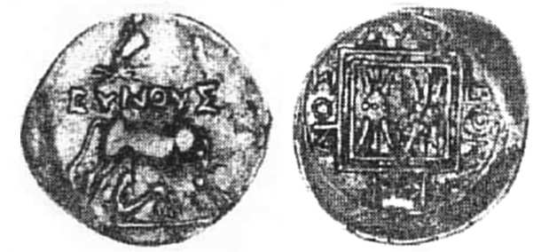 | Ceka 219 | Dyrrhachium, Illyria AR Drachm. After 229 BC. Magistrates Theodotos and Arimnastos. ΘEOΔOTOΣ, cow standing right, looking back at calf which it suckles, bunch of grapes below / ΔYΡ AΡIMNAΣTOY, square containing double stellate pattern. Ceka 219 (but bunch of grapes omitted). | Text | Image |
