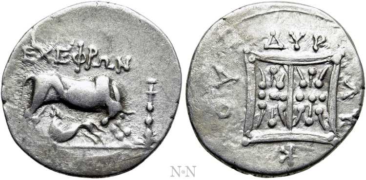 | Maier 366 | Dyrrhachium, Illyria AR Drachm. Magistrates Eunoys and Faniskos. 120-70 BC. 18 mm, 3.3 g. EYNOYΣ, cow standing right, looking back at calf which it suckles. Head of Isis right above, corn-ear and bunch of grapes in right field. / ΔYΡ ΦANIΣKOY, square containing double stellate pattern. Maier 366; Schlosser 238. | Text | Image |