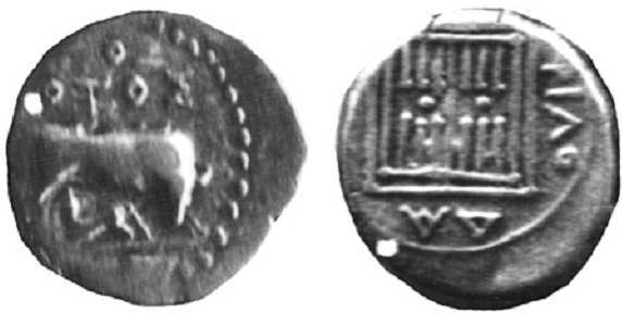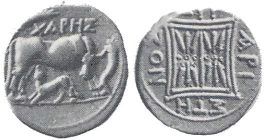| Gradeshnitza 2102 | Dyrrhachium, Illyria. AR drachm. Magistrates Zenon and Charopinos. ΞENΩN above cow standing right, looking back at calf which it suckles. Caps of the Dioskuri above, corn-ear to left, serpent-entwined staff to right. / XAΡOΠINOY around around double-stellate pattern with straight sides. Gradeshnitza hoard 2102. | Text | Image |
