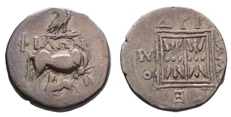 | Ceka 341 | Dyrrhachium, Illyria AR Drachm. 16 mm, 3.34 g. Magistrates Mnasen and Philokrates. MNA-ΣHN in two lines, above cow standing right, suckling calf. / ΔYΡ-ΦIΛO-KΡA-TEYΣ, square containing double stellate pattern. Ceka 341; Elea hoard 3673. | Text | Image |