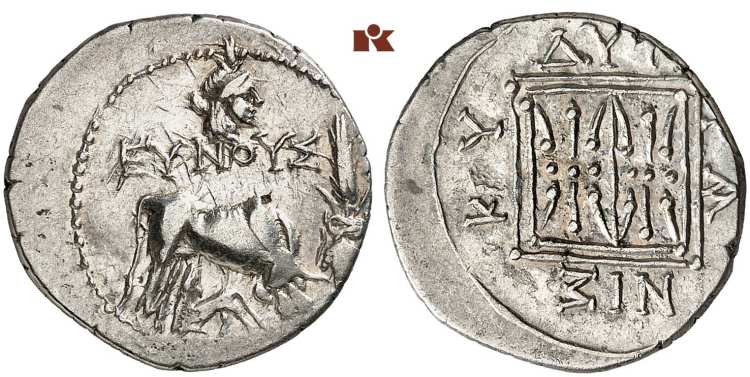 | Ceka 363 | Dyrrhachium, Illyria AR Drachm. 200-30 BC. Magistrates Zenon and Charopinos. ΞENΩN, cow and calf, eagle on sceptre above, quiver right / ΔYΡ XAΡO-ΠIN-OY around stellate pattern. Ceka 363; Mionnet Supp. 231-232; Maier 404. | Text | Image |