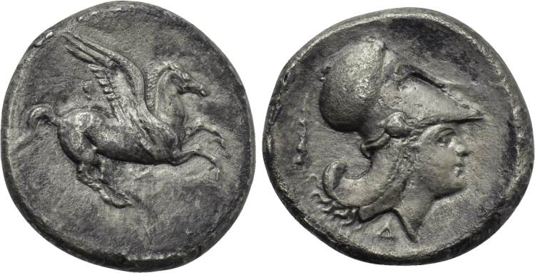 | BMC 10-11 | Dyrrhachium, Illyria, as colony of Corinth, AR stater. 350-300 BC. Pegasos with pointed wing leaping right. Δ below. / Helmeted head of Athena right, club and Δ behind head, dolphin swimming downwards in upper right field. Pegasi II 31; BMC Corinth 10-11; Traite II-4, 394. | Text | Image |