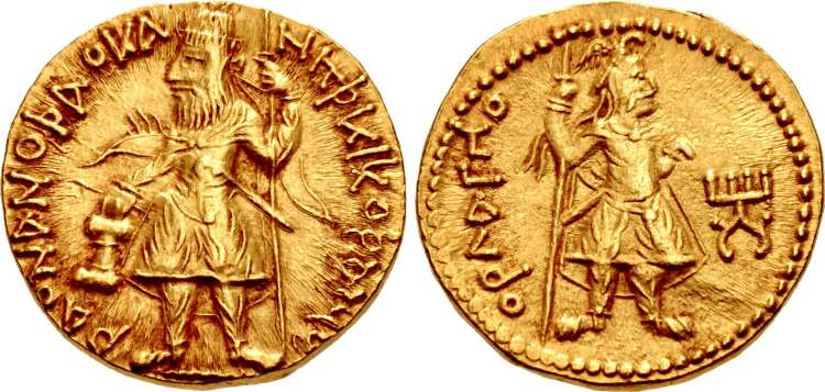 | Gobl MK 79 | Kushan Kingdom. Kanishka I. 127-140 AD. AV dinar (7.98 gm). B, emission 1. King standing left, right shoulder flaming, cloak flying, sacrificing over altar and holding goad in right hand and spear in left / Mithra standing left, radiate nimbus around head, extending right hand over tamgha and resting left hand on sword hilt. | Text | Image | |