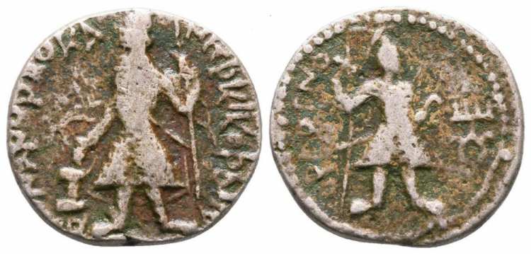 | BMC 46 | Kanishka, Kushan Kingdom, AE Tetradrachm, 17.00 grams, 25.07 mm. 78-103 AD. DAO KANhPKI, the king, wearing helmet and diadem, clad in coat and trousers, standing left with right hand outstretched over altar, holding spear in left hand / MIOPO, The Sun-god Mithras, standing left, diademed with radiate disk, clad as the king, right hand outstretched and resting left hand on sword at waist, tamgha to left. BMC 46; Whitehead 68. | Text | Image | |