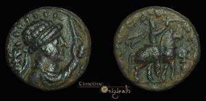 | MACW 2953 | Kushans, Soter Megas, c. AD 78-110, AE Tetradrachm. 8.35gm, 23mm, Taxila mint. Diademed, radiate bust right, holding sceptre; tamgha behind head / BACILEV BACILEVWN CWTHP MEGAC, Horseman right, holding whip; tamgha to right. | Text | Image |