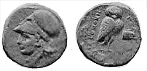 | Imhoof KM 8 | Ionia, Lebedos, AE18, Head of Athena / Owl right, 200-100 BC. Facing head of Athena, wearing triple-crested Attic helmet / ΛE KONNIΩN downwards to right and left of owl standing right, head facing. Imhoof KM 8. | Text | Image |