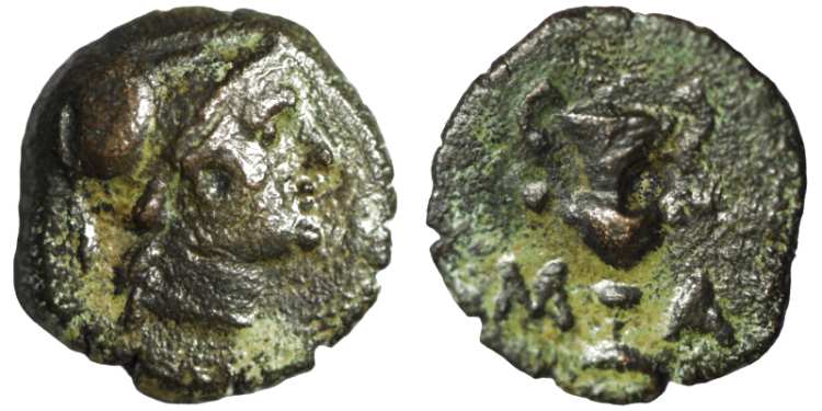 | Franke 26 | Methymna, Lesbos. Civic issue. 100-1 BC. AE 10 mm, 0.44 g. Helmeted head of Athena right. / M-A beneath kantharos, dot in left and right fields. BMC 34; Franke Methymna 26; Berlin 11877. | Text | Image |