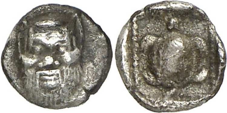 | G&M 196, 1632 | Methymna, Lesbos, AR hemiobol. ca 400 BC. 8 mm, 0.38 g. Bearded head of Silenos facing. / Tortoise in dotted square frame. Unpublished with square frame but several known. Aufhäuser 14, 127; Lanz 117, 112; G & M 196, 1632 (this example). See Traité 2263 below for the same type but in circular frame. | Text | Image |