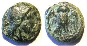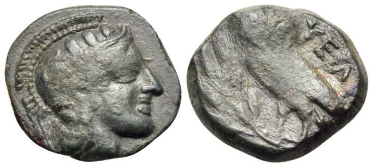 | BMC 131 | Velia, Lucania. 390-200 BC, AE 11mm; 1.7g. Helmeted head of Athena right / YEΛH-TΩN, owl standing right, head facing, wings closed. BMC 131; Hands, Magna Graeca, p. 153, VII. | Text | Image |