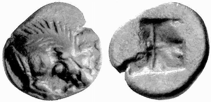 | SNG Munich 837 | Velia (Hyele), Lucania. AR obol. 510-460 BC. 8 mm, 0.5 g. Forepart of lion right, tearing at stag's leg. / Quadripartite incuse square. SNG Munich 837. | Text | Image |