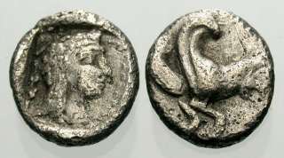 | Falghera 90 | Dynasts of Lycia (or Caria). Uvug (or Orou) 470-440 or 490-470 BC. AR eighth stater, 12 mm, 1.5 g. Forepart of winged man-headed bull left. / Female head left in dotted square border within incuse square. Falghera 90-93; SNG Cop Suppl. 4301. | Text | Image |