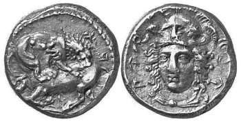 | SNG Berry 1189 | Lycia, Vedevie and Perikles, Eighth Stater, 1.24 g. ca 370 BC. Antiphellus. [FF] E, Lion right, attacking bull kneeling left, head raised. / Bust of Athena facing, wearing triple-crested Attic helmet ornamented with a winged siren, chlamys tied beneath her chin, triskeles to left. SNG Berry 1189. SNG von Aulock 4247-4248. | Text | Image |