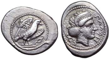 | Roma 9, 387 | Pinara, Lycia, AR Stater, ca 400-390 BC, 23 mm, 8.49 g. Π (Lycian b), eagle standing right, wings spread, diskeles in lower right field. / ΠΛΛEWI (in Lycian), head of Aphrodite right, hair in amphyx and sphendone, diskeles in lower left field, all within circular incuse. Unpublished. Roma 9, 387. | Text | Image |